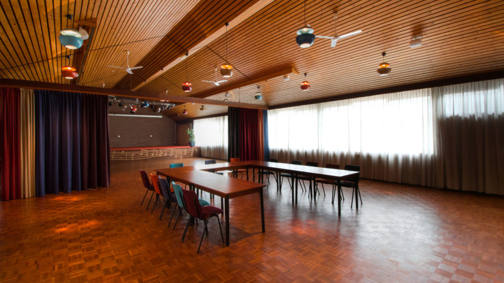 De grote zaal beschikt over een uitbreidbaar toneel met professionele licht- en geluidsinstallatie, inclusief ringleiding voor slechthorenden. De stijlvolle houten vloer is perfect voor dans en evenementen.