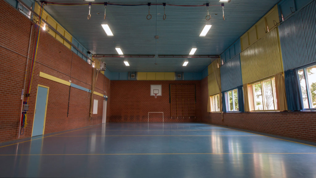 De zaal beschikt over twee kleedruimtes met toiletten en douches, plus een aparte berging voor sport- en gymmateriaal.